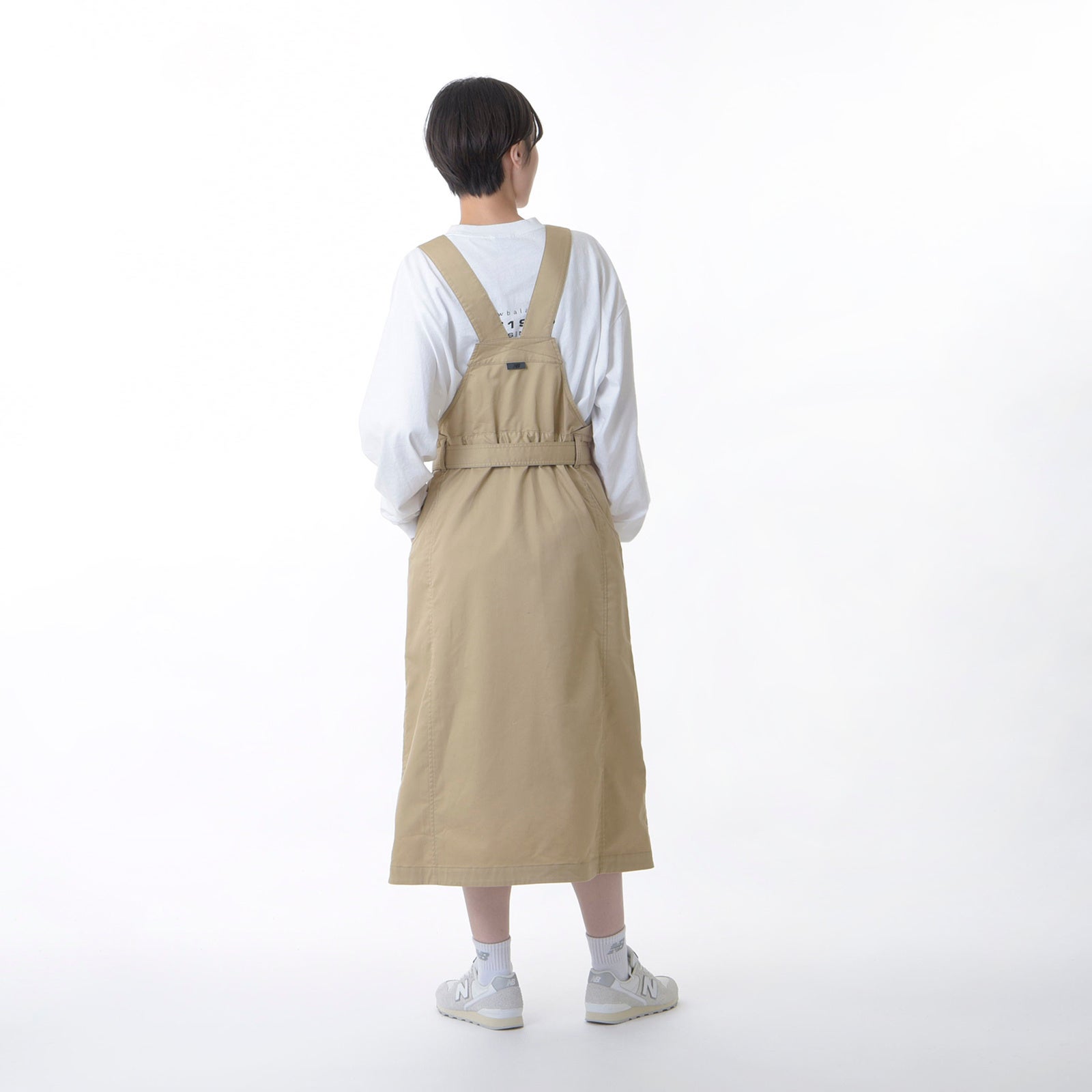 ストレートシルエットのミモレ丈のジャンパードレス。フロントに大きなマチ付きパッチポケット、両サイドには前後に渡る大型ポケットをレイアウト。ウエストはボックス風ながらバックサイドにゴムシャーリングを配しフェミニンに演出しました。共地ベルトはトレンチのように絞る、後ろでラフに束ねる、とアレンジ自在です。ビブはショルダーベルトで長さを2段階調整可能。下に垂らしてスカート的な着こなしもおすすめです。