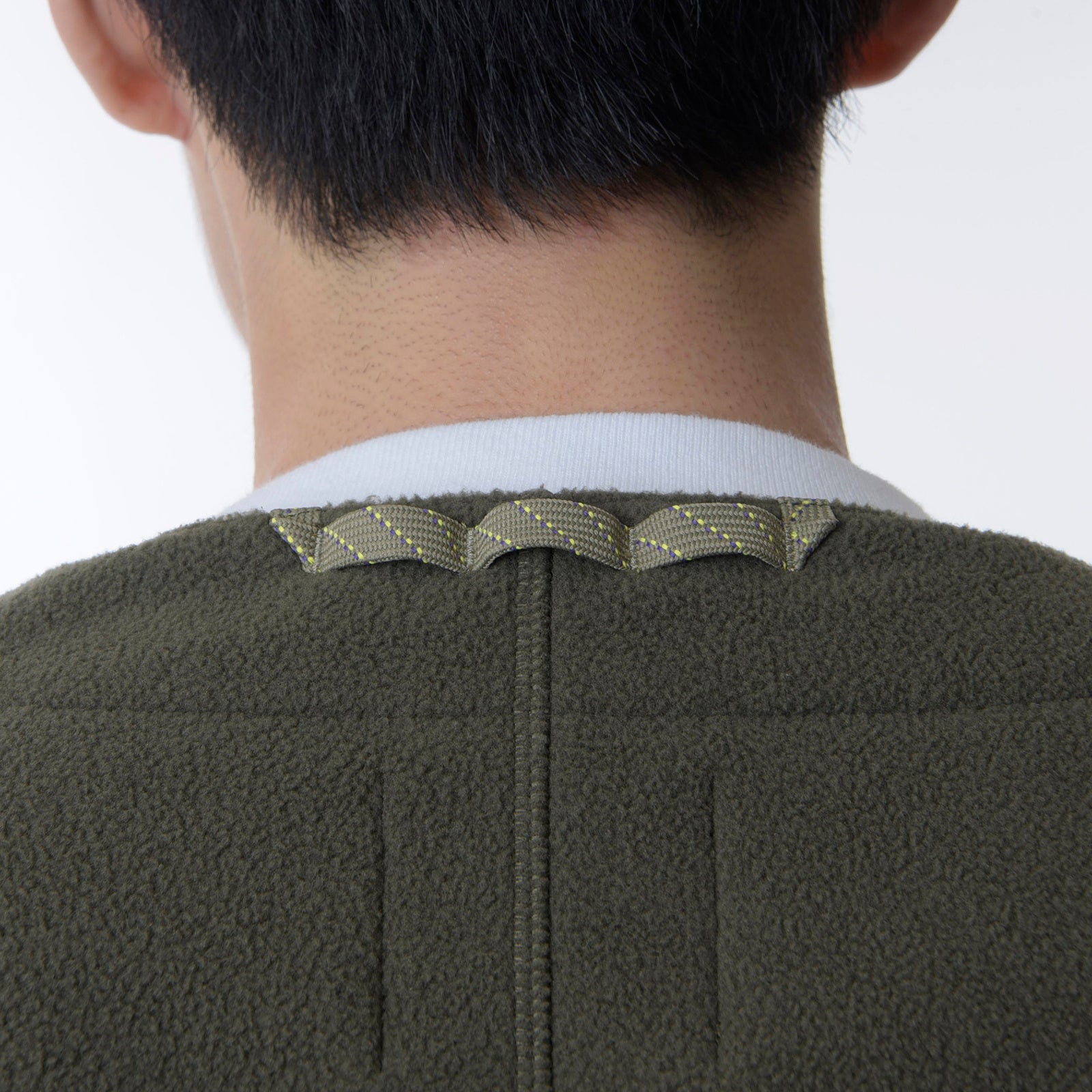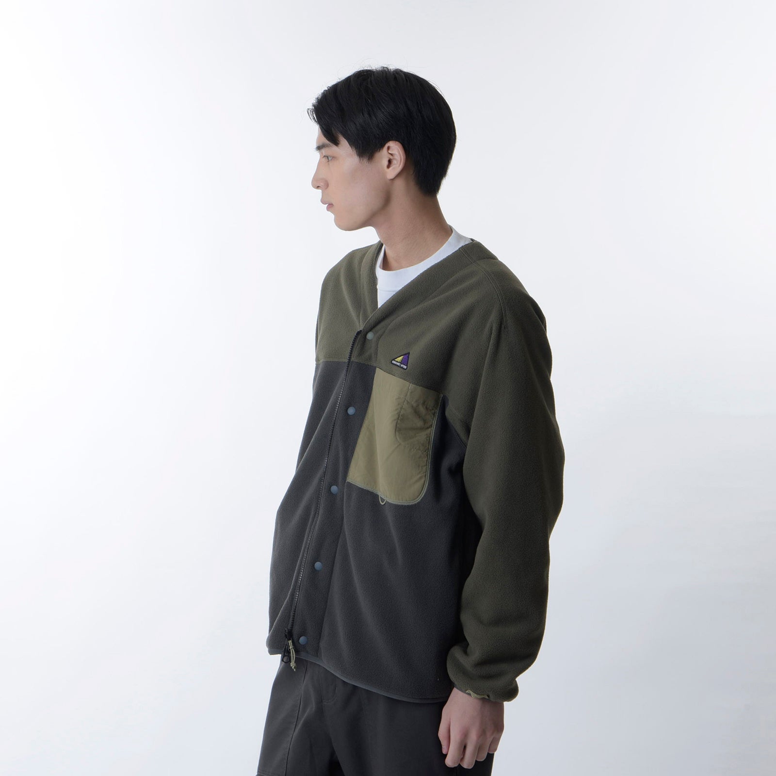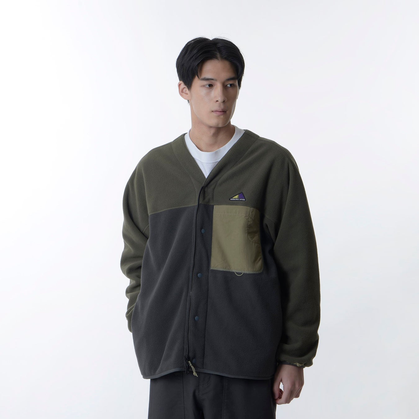 メイン素材からファスナーまでリサイクルマテリアルを使用し、タクティカルイメージで仕上げたフリースカーディガン。寒さに応じて身幅を調整できるファスナーとドットボタンの2WAYクロージャーシステム、可動域を高めるワンピースヨークスリーブを採用し、ストレスフリーな着心地を提供します。大きめの布帛ポケットには、ミニランタンを挿して使用できる便利なミニポケット付き。家の中から山まで幅広くカバーします。