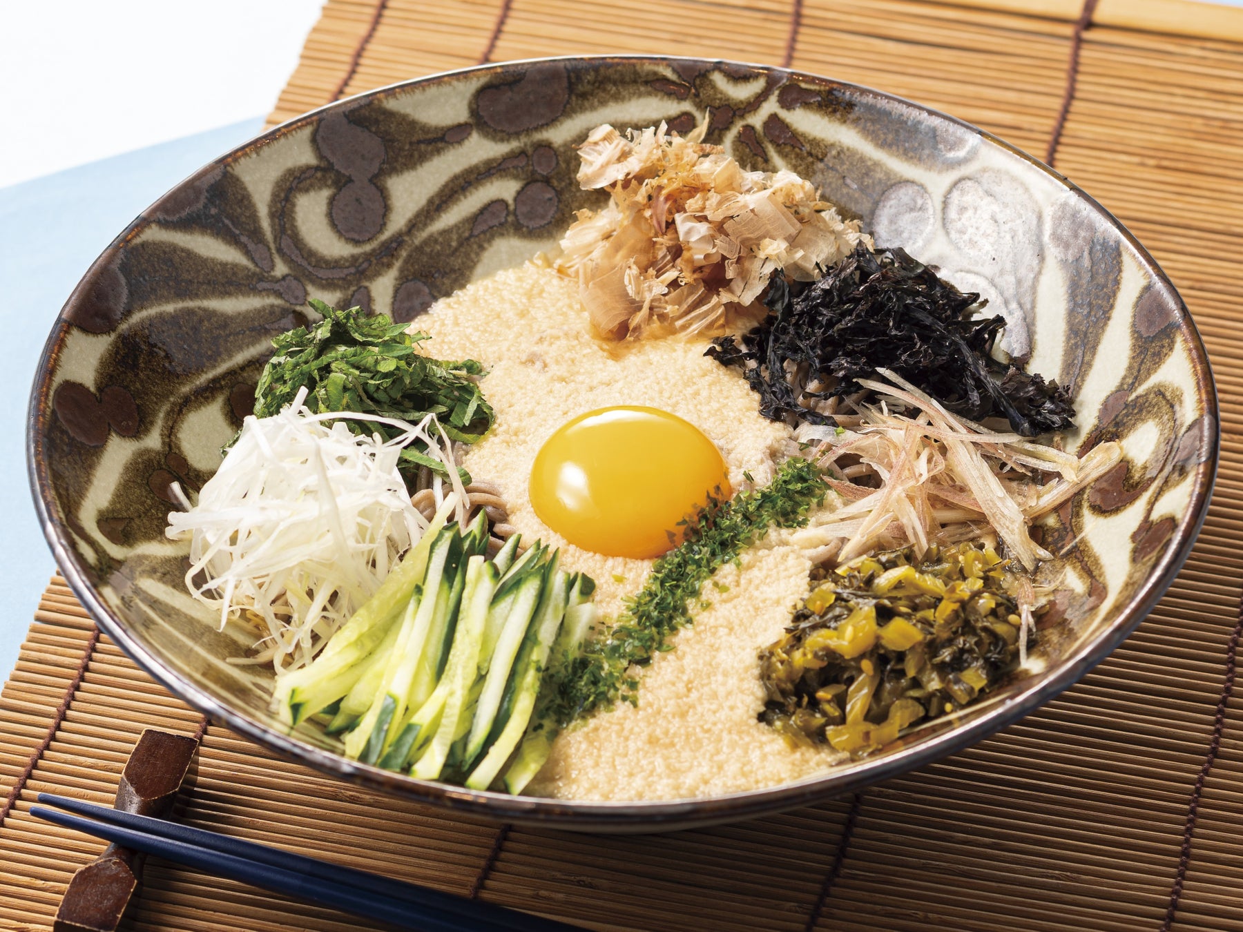 すりおろしたとろろに、削り節・もみ海苔・みょうが・高菜漬・しそ・白髪ねぎ・きゅうりの7種の薬味をそばとよく混ぜ合わせることで、異なる食感や豊かな風味を味わえる一皿に仕立てました。