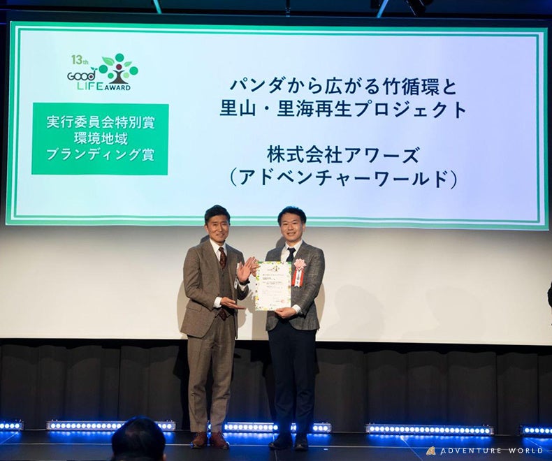 この度、アドベンチャーワールド(和歌山県白浜町)の取組が、環境省主催「第13回グッドライフアワード」において、実行委員会特別賞 「環境地域ブランディング賞」 を受賞しました。本アワードは、環境と社会によい暮らし(グッドライフ)の実現につながる、地域・企業・団体・個人の取組を表彰する制度で、今回は224件の応募の中から39件が授賞されました。受賞対象となった「パンダから広がる竹循環と里山・里海再生プロジェクト」は、これまでジャイアントパンダの繁殖研究を通じて生物多様性の保全や種の保存に貢献してきた取組を土台に、その過程で生じる竹(食べ残し竹を含む)や、繁殖研究を通じて培われた知見・関係性を循環の仕組みへと転換し、地域の共創につなげてきた点が評価されたものです。