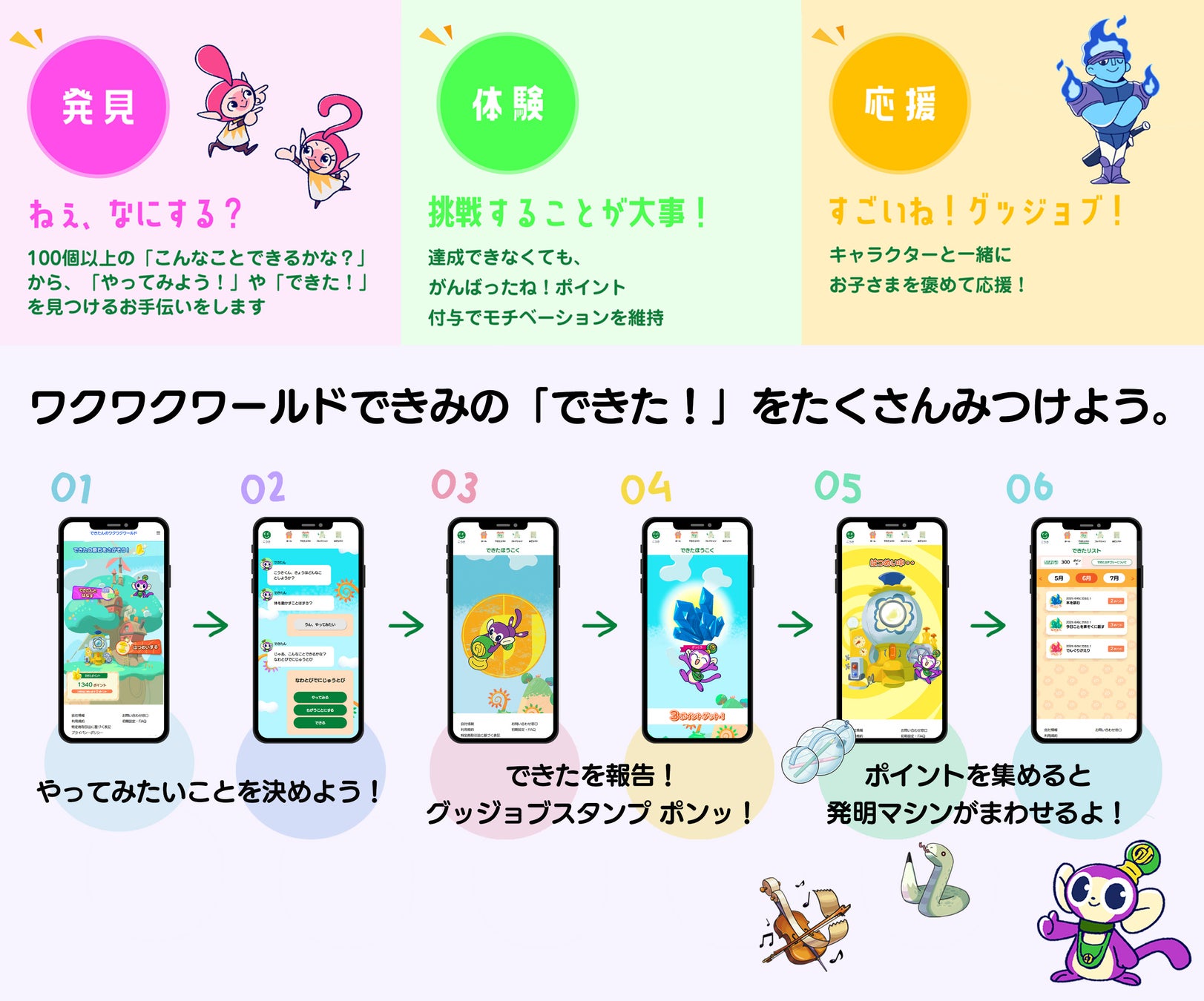 本アプリでは、メインキャラクター「できたん」との対話を通じて、100以上のテーマから日常の「やってみたい」ことを親子で選び、実際の行動につなげる仕組みを用意しています。