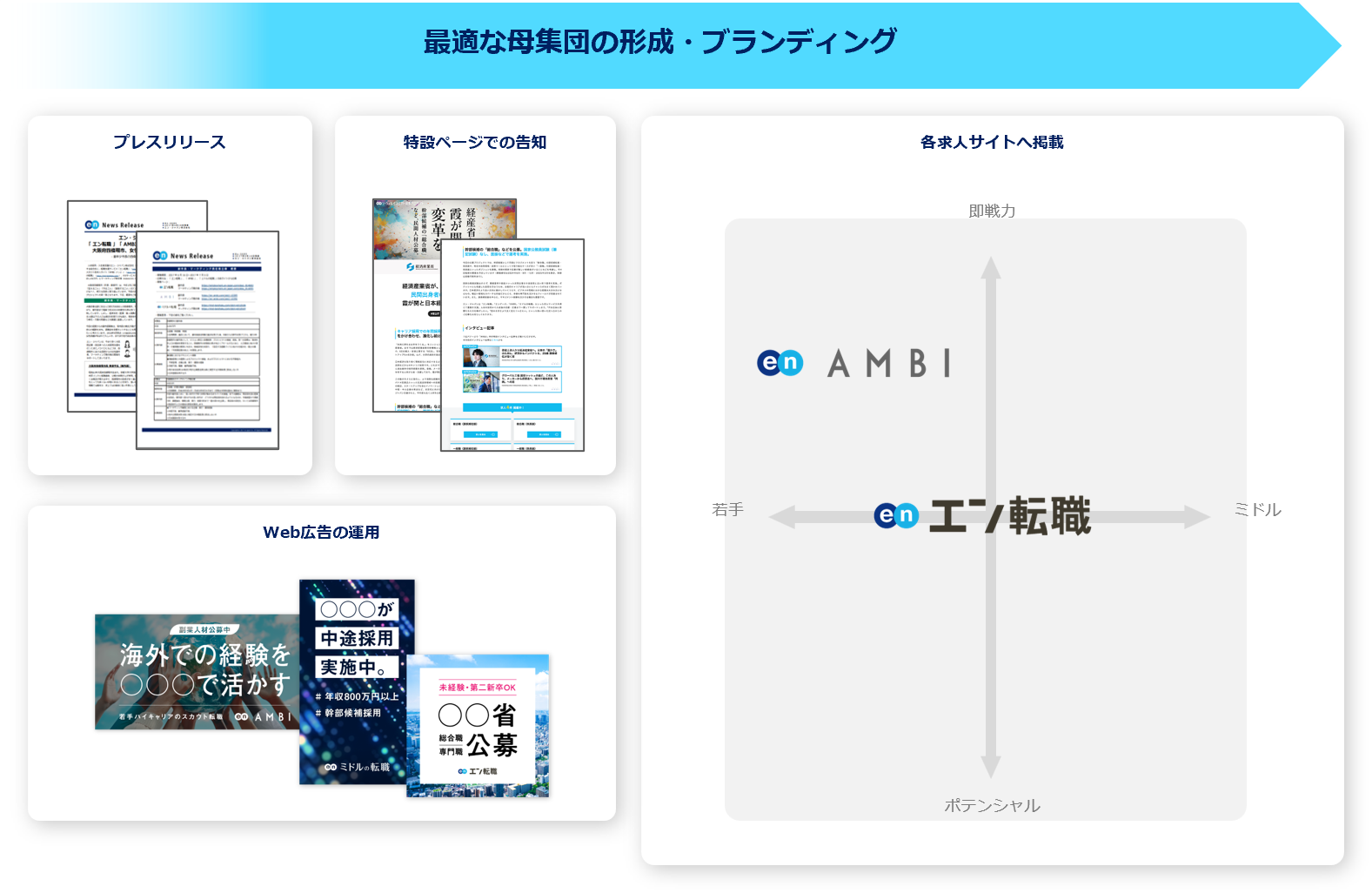 プレスリリースや特設ページ、Web広告での告知に加え、各求人サイトでの集客支援を実施。『AMBI』『エン転職』とターゲットの異なる求人サイトを活用することで、ターゲットへ網羅的に求人を届けます。