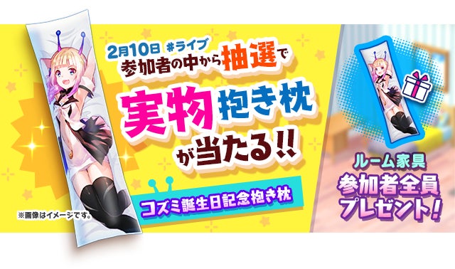 本#ライブに参加するとルームにおける家具「コズミ抱き枕」をプレゼントいたします。さらに、抽選で3名様に「実物のコズミ抱き枕」をお送りさせていただきます。#ライブを盛り上げるために、是非エールや#のかけらを集めるなど、準備をしてお待ちください。