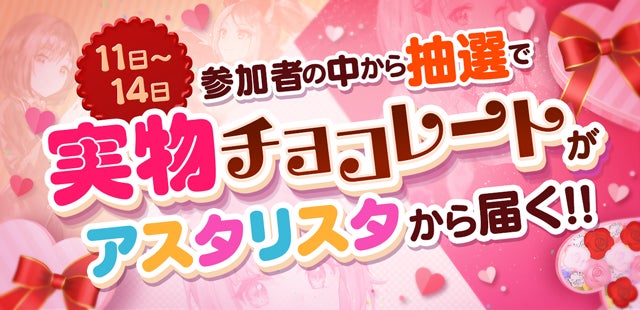 アイズを倒して復元すると、「バレンタインフラワー」や「ラブリーバルーン」のほか、アスタリスタの形をした「アスタリスタチョコ」などのエールを獲得できます。詳細はゲーム内をご確認ください。また、今回登場するエールを2月11日~14日のバレンタイン#ライブで差し入れすると、獲得できるアスタポイントが1.5倍になります。是非エールを獲得してお待ちください。