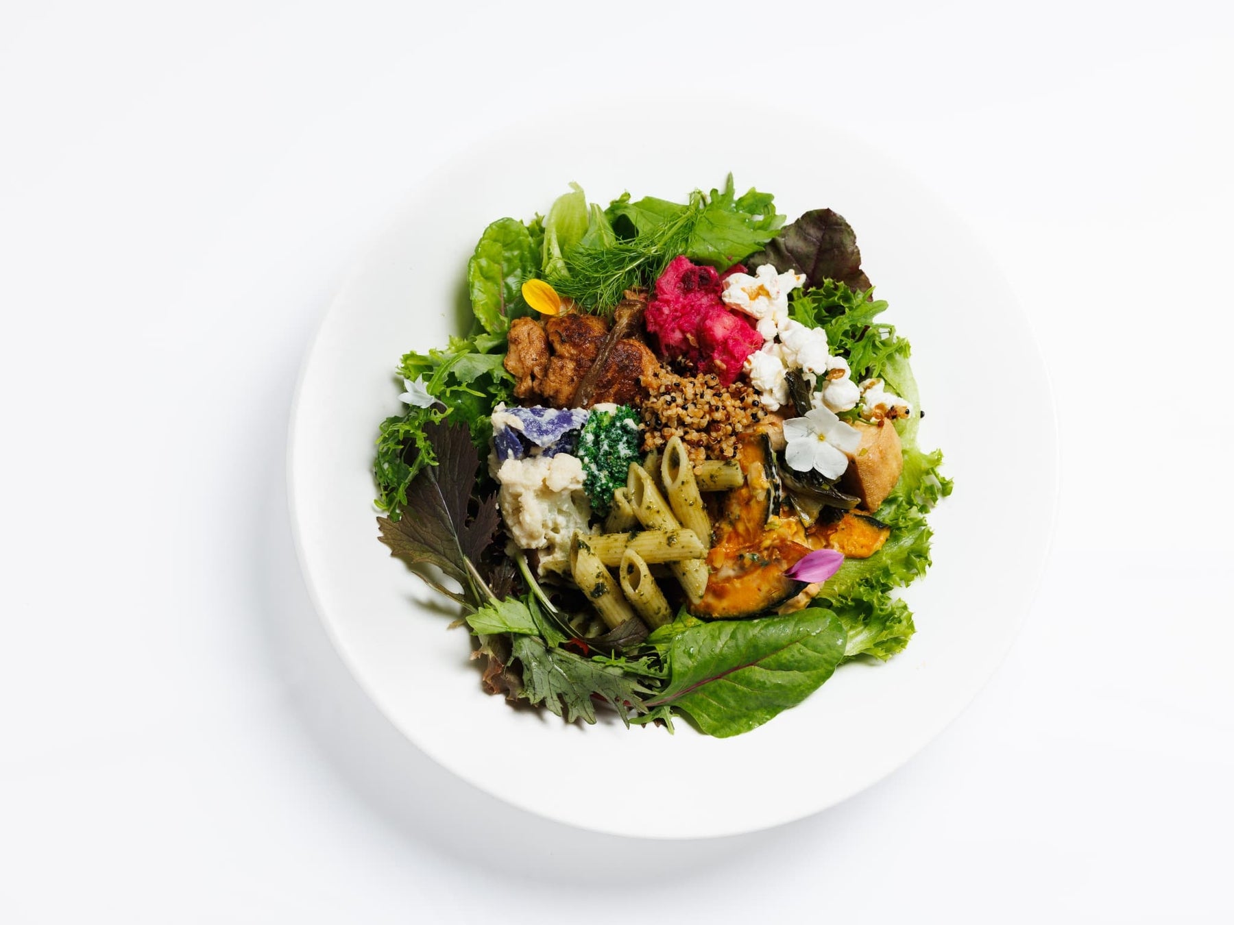このたび、人気のヴィーガンデリプレート「ブッダボウル」(税込2,420円)がリニューアル。バジル香るパスタ、カシューナッツのクリーミーサラダ、スイートチリ厚揚げなど、個性豊かな6種のデリを一皿に盛り付け、彩り・味・満足感すべてをアップデートしました。動物性食材を使用せずとも心身が満たされるプレートに仕上げています。
