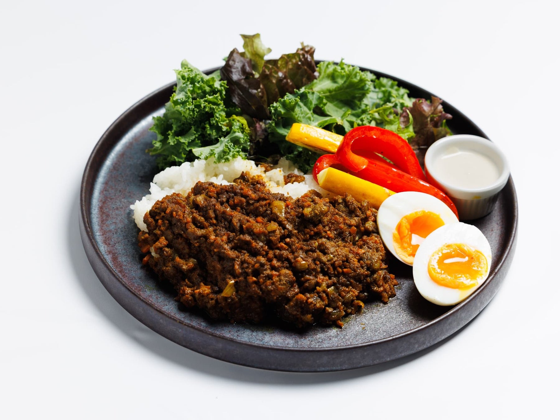 香ばしくスパイスを効かせた国産の和牛のキーマに、半熟卵のまろやかさを添えて。ココナッツミルクや塩麹を隠し味に、奥行きある味わいに仕上げました。ヘルシーなのに食べ応えもたっぷりの一皿です。