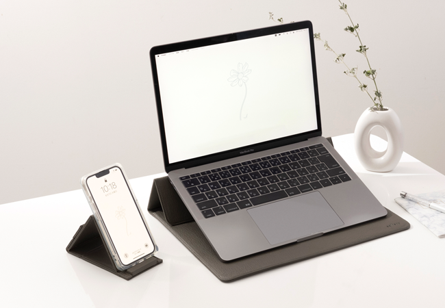 salistyのPCケースやキャッシュレスケースと同じPUレザー生地を使用しているのでデスク回りに統一感が出ます。