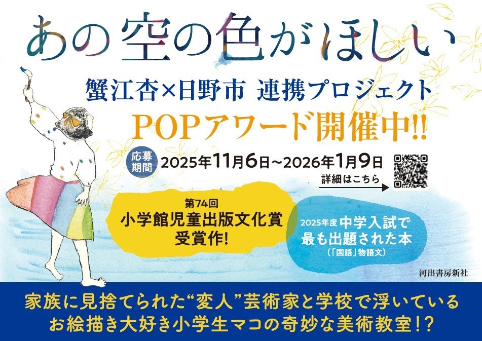 株式会社河出書房新社(東京都新宿区/代表取締役⼩野寺優)から刊⾏している、蟹江杏さんの初⼩説『あの空の⾊がほしい』(2024年5⽉30⽇発売、税込定価1,980円)について、本日11月6日(木)より、蟹江杏さんと東京都・日野市の連携プロジェクト〈『あの空の⾊がほしい』POPアワード〉の作品募集がスタートしますことをお知らせいたします。
