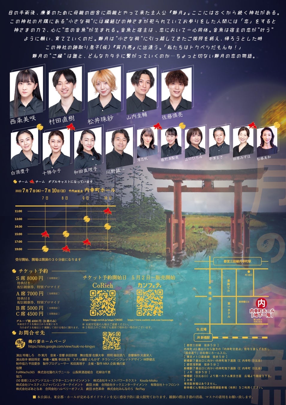 MKA企画 鵺の宴 旗揚げ公演『月の金魚』が2022年7月7日 (木) ~2022年7月10日 (日)に千代田区立内幸町ホール(東京都千代田区)にて上演されます。チケットはカンフェティ(運営:ロングランプランニング株式会社、東京都新宿区、代表取締役:榑松 大剛)にて5月2日(月)10:00より発売開始です。