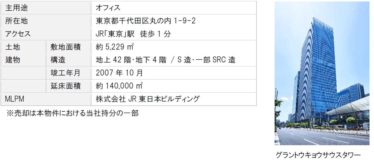 〇このたび、東日本旅客鉄道株式会社(以下「JR東日本」)が所有しているグラントウキョウサウスタワーなど計3件の開発物件を、JR東日本不動産投資顧問株式会社(以下「JAM」)が運用する私募リート「JR東日本プライベートリート投資法人」に売却しました。