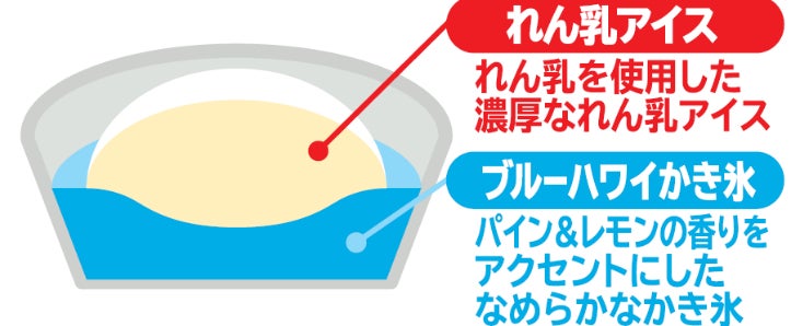 「森永れん乳アイス ブルーハワイフロート」は、爽快感のあるブルーハワイ味のかき氷の上にれん乳アイスをドーム状にのせた氷菓カップアイスです。かき氷にはパイン&レモンの香りをアクセントに加え、すっきりとした味わいに仕上げており、かき氷の清涼感とれん乳アイス独特のコク、甘さの組合せをお楽しみいただけます。