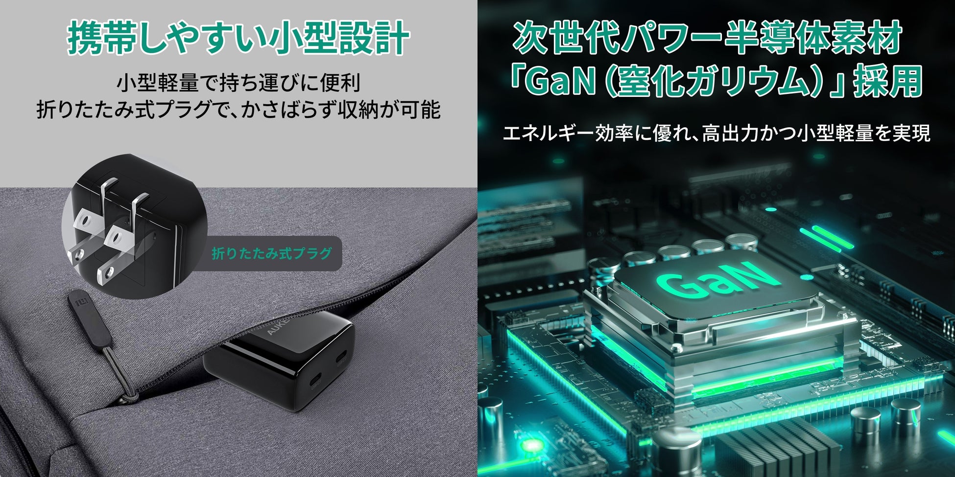 次世代パワー半導体素材「GaN(窒化ガリウム)」を採用しているのでエネルギー効率に優れ、高出力かつ小型軽量を実現しました。高性能な充電器なのに本体の重量はわずか67gほどです。また、プラグは折りたたみ式なので、かさばらず収納できて持ち運びに便利です。