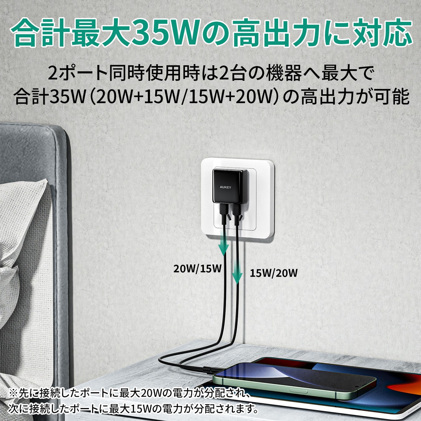 2つのUSB-Cポートを備え、自宅、オフィス、外出先などで、2台の機器を同時に充電する事ができます。2ポート同時使用時は合計で最大35W (C1 + C2: 20W+15W / 15W+20W) の出力が可能です。