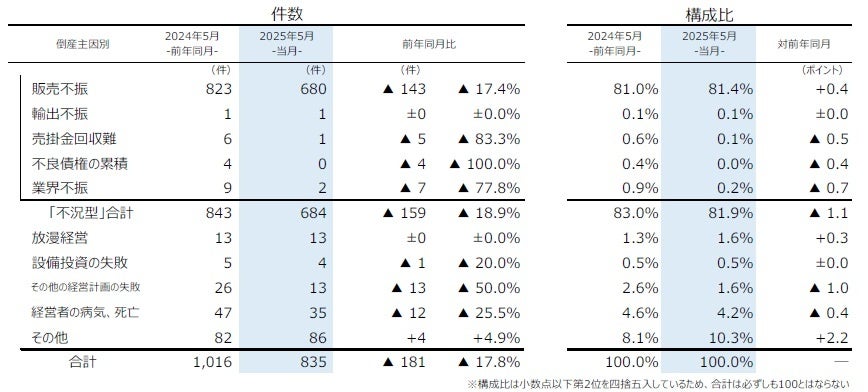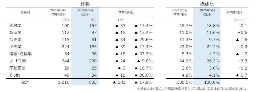 2025年5月の企業倒産は835件 倒産件数、3年1カ月ぶりに前年を下回る緩やかな増加ペースは継続 ― 全国企業倒産集計2025年5月報