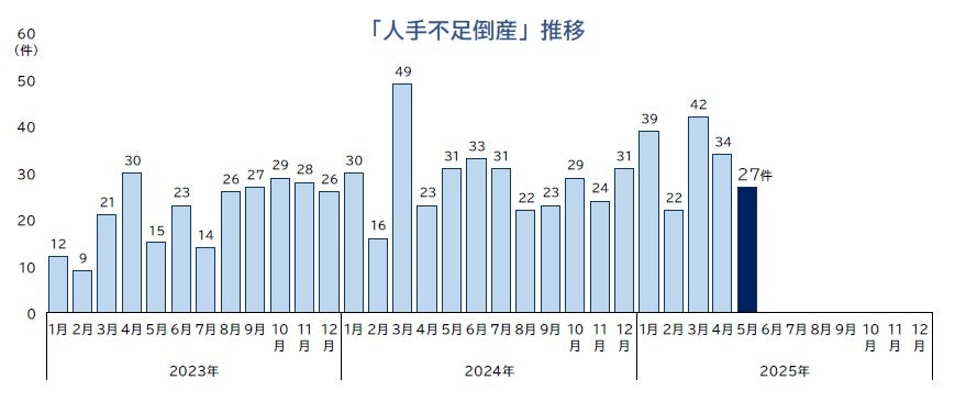 「人手不足倒産」は、27件(前年同月31件、12.9%減)判明し、2カ月ぶりに前年を下回った。業種別にみると、『サービス業』(10件)が最も多く、『建設業』(7件)や『製造業』(5件)、『運輸・通信業』(4件)が続いた。2025年1-5月の累計は164件となり、過去最多となった前年同期(149件)を上回るペースで推移している。