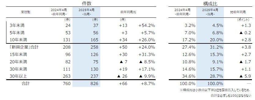 業歴10年未満の『新興企業』〈「3年未満」(前年同月38件→34件、10.5%減)、「5年未満(同71件→48件、32.4%減)、「10年未満」(同206件→171件、17.0%減)〉は253件(前年同月315件、19.7%減)となった。内訳を業種別にみると、「サービス業」(同89件→86件、3.4%減)が最も多く、「小売業」(同91件→65件、28.6%減)、「建設業」(同51件→50件、2.0%減)が続いた。