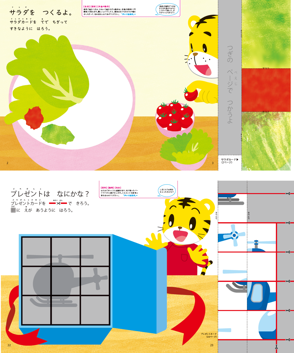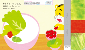 特長:クレヨンで自由に描いて遊ぶことから始め、ちぎったりはったり、はさみで切ったりする工作の基本動作を学びます。「しまじろうの誕生会」で、料理や飲み物、カラフルな飾りつけなどの準備をしていくストーリーの中で工作に楽しんで取り組めます。