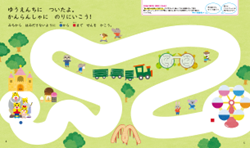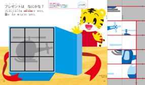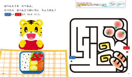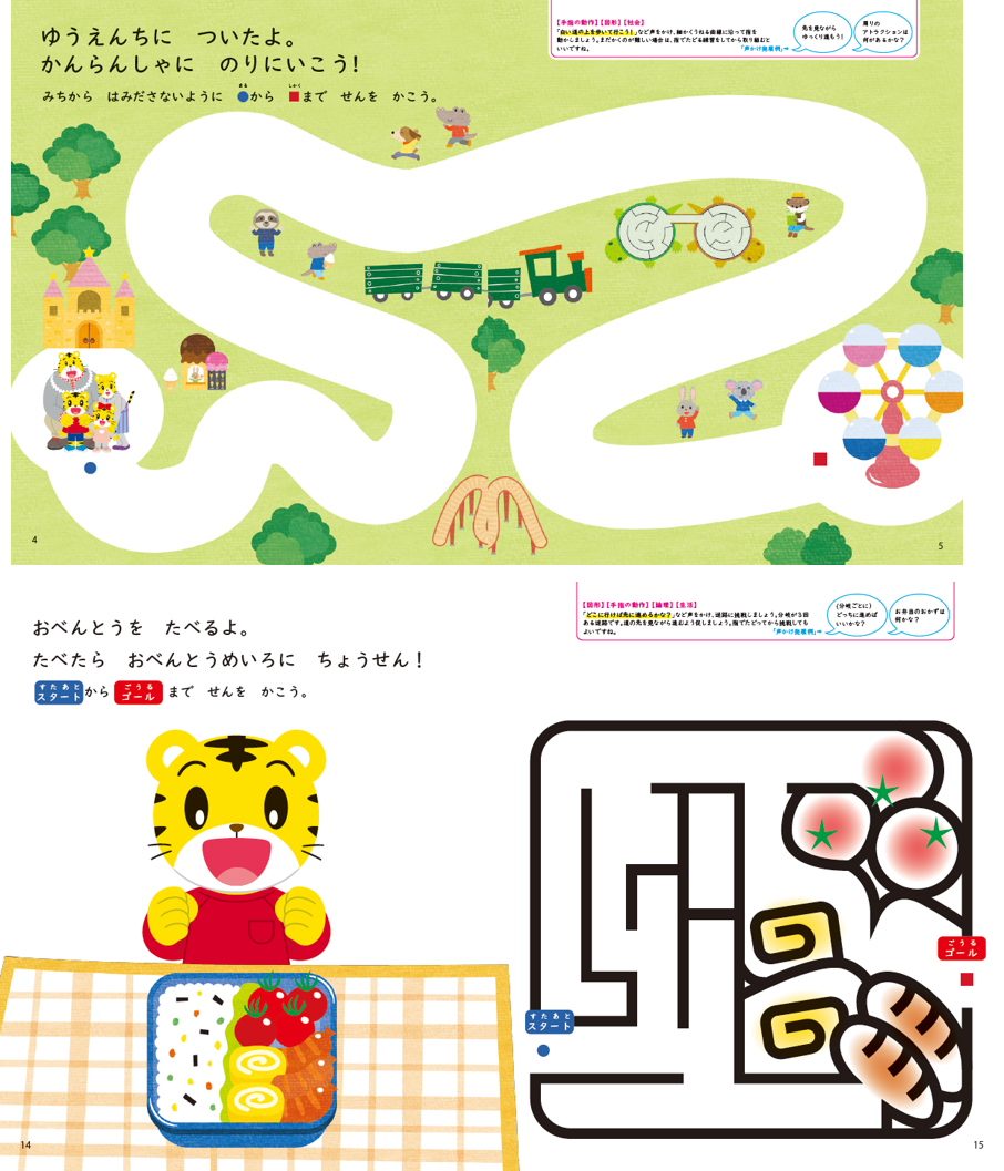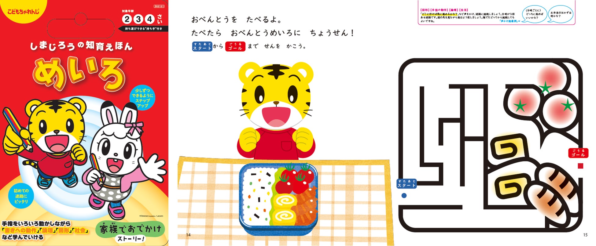 特長:スタートからゴールまで、はみ出さないように指で道をたどる練習から、運筆練習、迷路へとステップアップしながら学んでいきます。迷路では、先を見通したり、条件に合わせて進んだりする練習を通して、論理の基礎力を養います。また、「しまじろう家族のお出かけ」のストーリーの中で、擬似的な社会体験もできます。