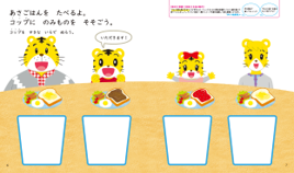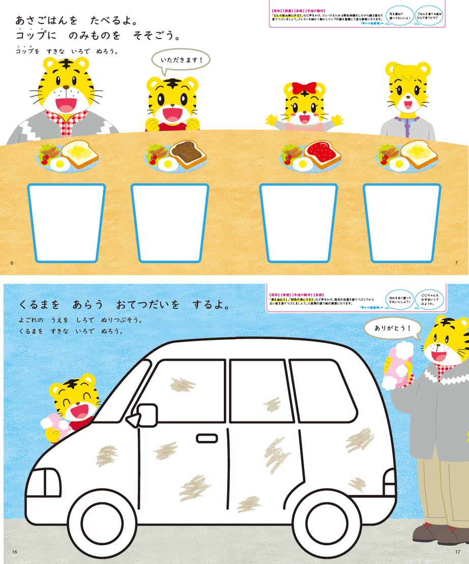 特長:クレヨンを動かす(運筆)練習から、クレヨンで塗る練習へとステップアップしながら学べます。「しまじろうの一日」をテーマにしたストーリー展開の中で、挨拶や生活習慣についても確認できます。