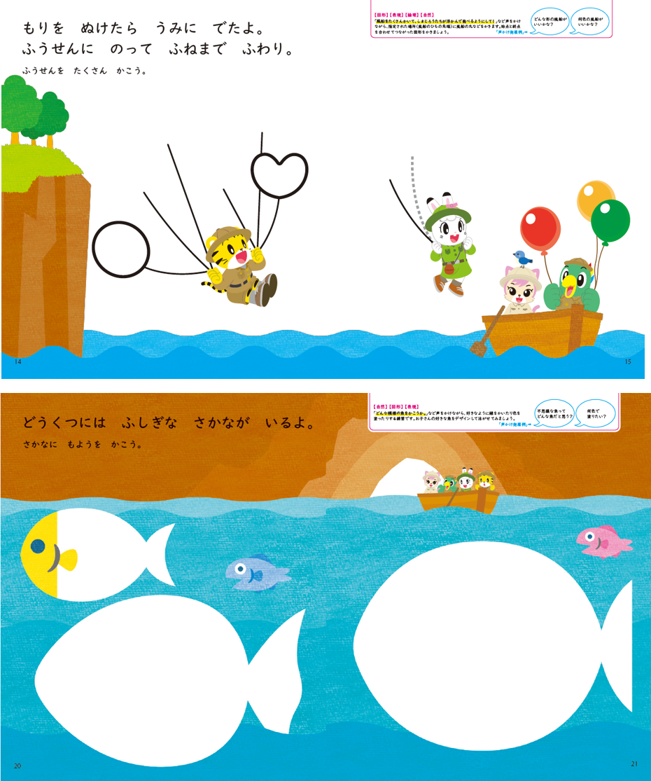 特長:直線や点線、曲線などのいろいろな線を描く練習をした後に、自由に想像をふくらませて絵を描いていきます。「しまじろうたちの冒険」のストーリーの中では、子どもの好きな動物や海の生き物が登場し、自然にふれあう追体験ができます。