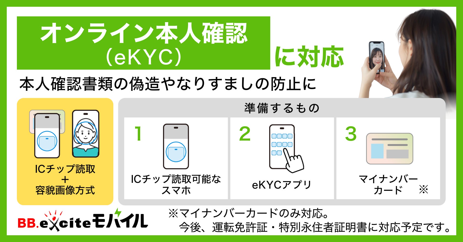 エキサイト株式会社(本社:東京都港区、代表取締役社長:西條晋一)が提供する格安SIMサービス「BB.exciteモバイル」は、3月18日に契約手続きにおける本人確認手続きを変更し、オンライン本人確認(eKYC)によるICチップ読み取り+容貌撮影方式に対応したことをお知らせします。