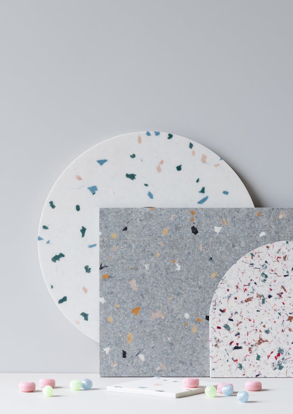 ステラポップは、取り入れる廃棄素材によって浮かび上がる色味が変わります。リサイクル材でありながら、ポップなカラーやデザイン性も非常に高く、デザイナーの評価も高い素材です。
