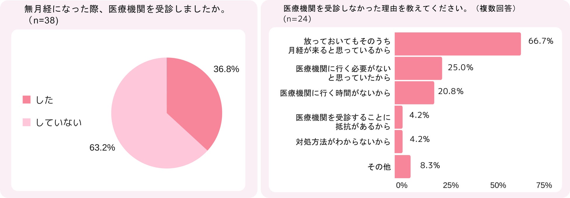 さらに、「三主徴」のうち、無月経の経験について「ある」と答えた人が22.7%おり、その際、医療機関を受診していない人が63.2%いることが分かりました。受診しなかった理由を尋ねると、最も多い回答は「放っておいてもそのうち月経が来ると思っているから」66.7%、次いで「医療機関に行く必要がないと思っていたから」25.0%、「医療機関に行く時間がないから」20.8%となりました。無月経は、婦人科系の疾患などが隠れている可能性もありますので、放置せずに婦人科を受診することをおすすめします。