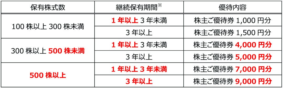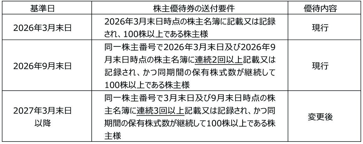 ※株主優待内容が変更となる2027年3月末日時点において、継続1年以上の場合とは2026年3月末日時点より、また、継続3年以上の場合とは2024年3月末日時点より同一株主番号で継続して100株以上の株主様が株主優待券の送付対象となります。