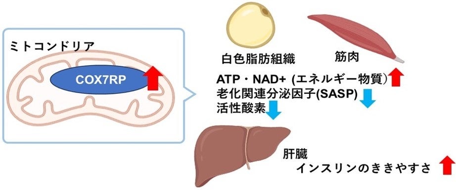 ・その一方で、白色脂肪や筋肉で、SASP(注6)と呼ばれる老化に関わる物質が減少していました。また、老化の原因とされる活性酸素も減少していました。つまり、COX7RPの発現量が増加したことで、老化に関わる物質が減少していたのです。