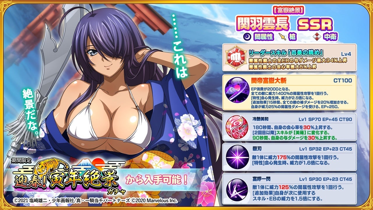 本日から始まる「迎春!寅年絶景ガチャVol.1」では、新たに「【富嶽絶景】関羽雲長」(CV:生天目仁美)」が登場。同ガチャでは、「【富嶽絶景】関羽雲長」の排出率が他の同レアリティの闘士よりも高くなっております!▽「迎春!寅年絶景ガチャVol.1」 開催期間