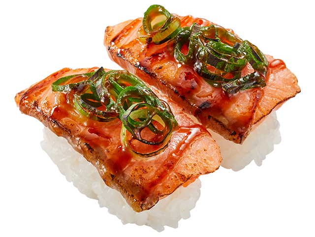 人気ネタサーモンに、青ねぎとちゃんちゃん焼きのタレをのせて炙り、北海道郷土料理のちゃんちゃん焼き風に仕立てました。