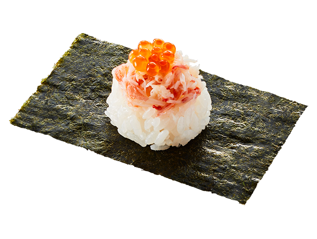 ずわい蟹のほぐし身の上にいくらをのせ、海苔包みで。