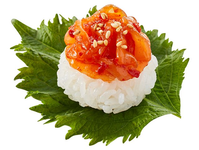 コリコリした食感のほたてひもチャンジャ風をシャリと合わせ、大葉で包んでお召し上がりいただきます。