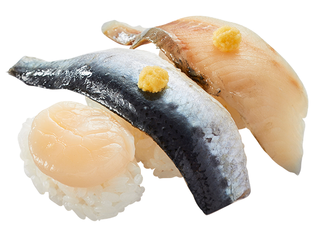 ほたて・北釧〆いわし・にしん、贅沢3貫を一皿でお楽しみください。