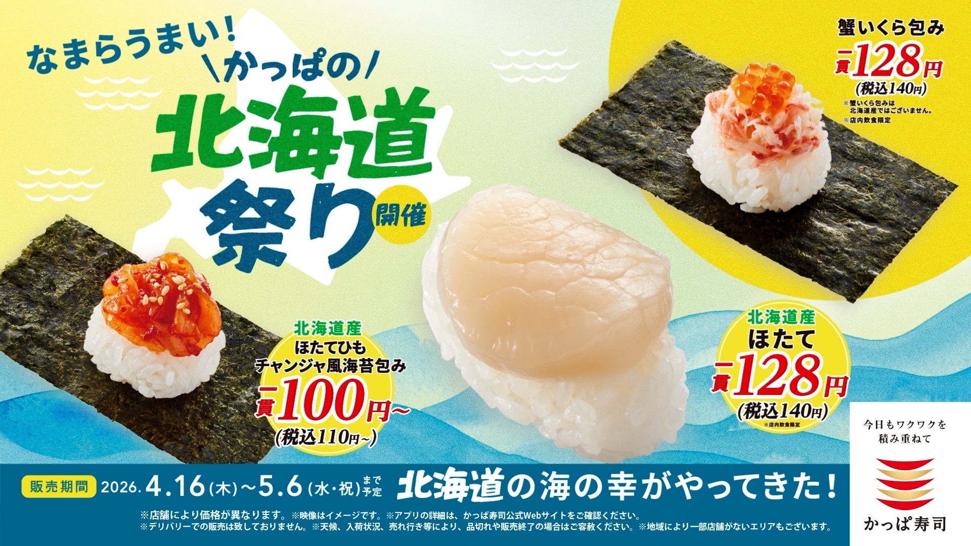コロワイドグループのかっぱ寿司(カッパ・クリエイト㈱ 本社:神奈川県横浜市、代表取締役社長:山角豪)は、2026年4月16日(木)~5月6日(水)の期間、「かっぱの北海道祭り」をかっぱ寿司全店にて開催いたします。
