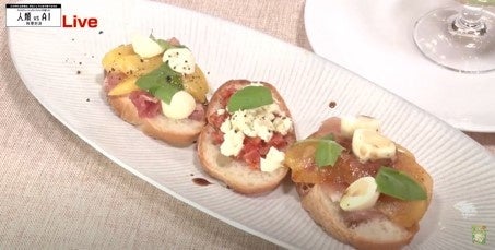 一方AI代表の鈴木教授は1品目の『三彩タルティーヌ』を作り進め 、「”甘・辛・甘”をポイントにして、彩りと味の多様性がAIらしいメニューです!」と自信を持って完成させました。