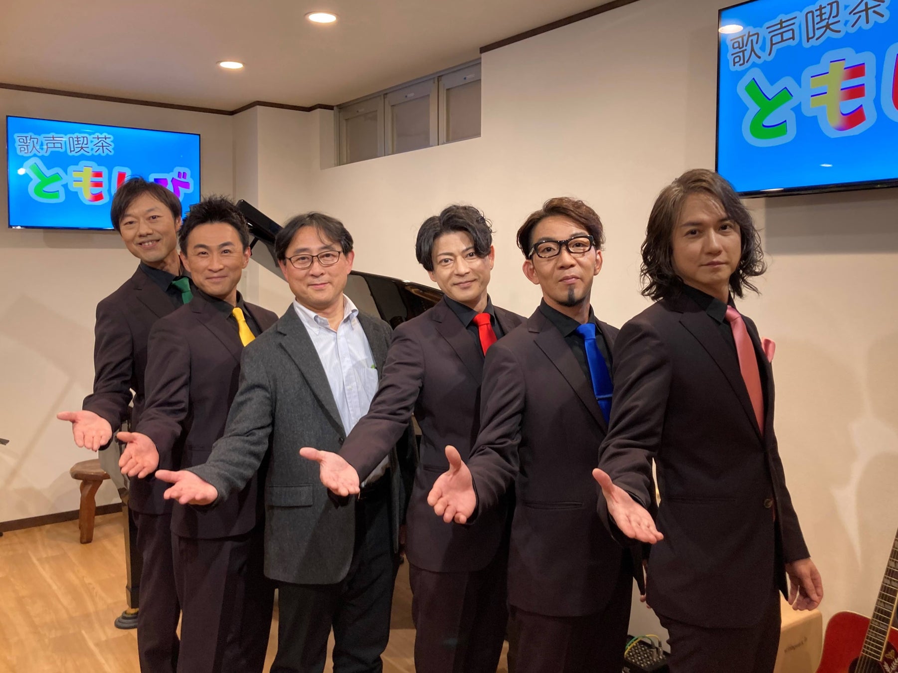 5人組コーラスグループのベイビーブーが、2年ぶりとなる営業を再開した歌声喫茶「ともしび」を訪れ同店の再出発を祝福した。