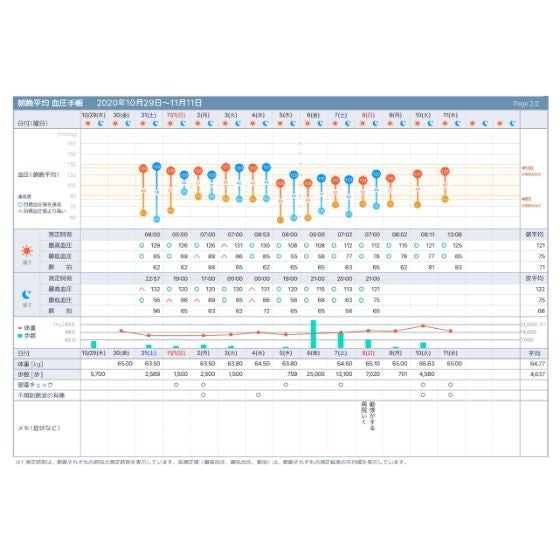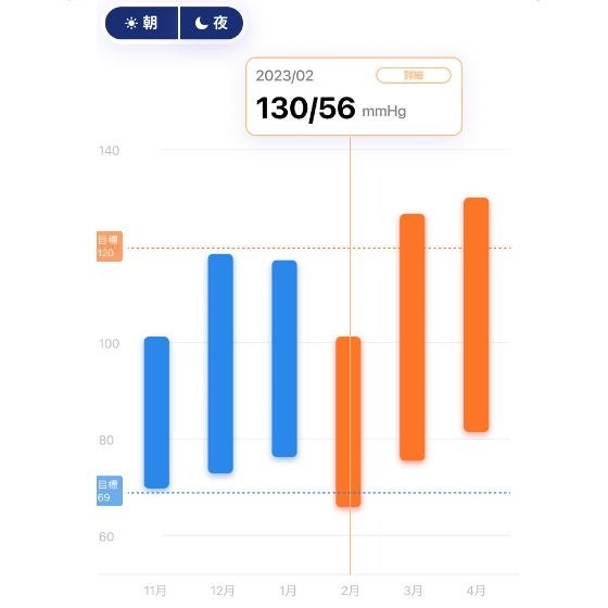 毎日の血圧の最高値・最低値をグラフで可視化。朝と晩の計測値を個別に表示します。