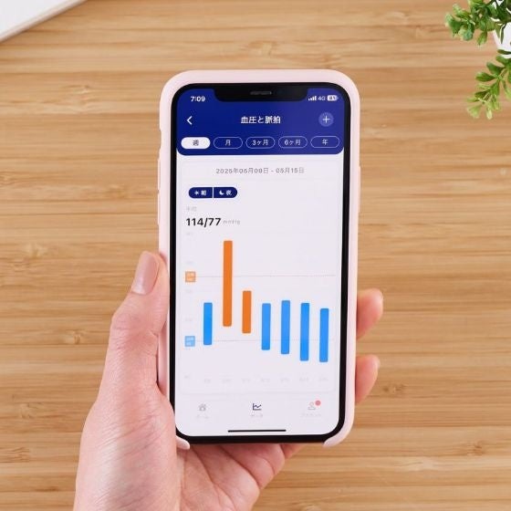 専用スマートフォンアプリ「ELECOM Healthcare」に測定したデータを記録可能。血圧の変化をグラフで確認できます。