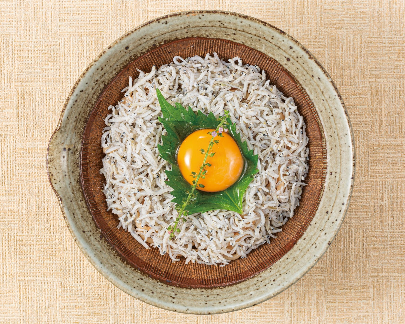 ふわふわの釜揚げしらすにごま油を垂らした卵黄と大葉がシンプルなたらこスパゲティを引き立てます。