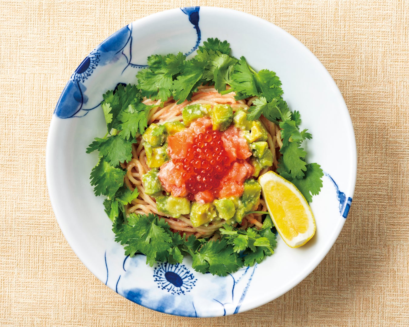 塩麴漬けサーモン、アボカド、いくらにパクチーをのせた具材感たっぷりのたらこスパゲティ。