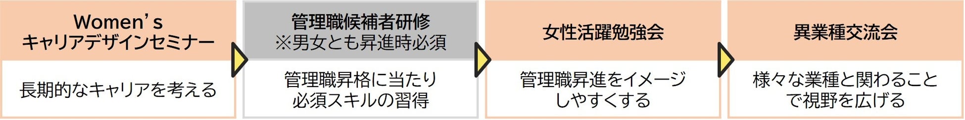 これから管理職になる予定の女性社員の不安も解消するため、翌期昇格予定者でサポートを希望する女性社員を対象に、同職種の女性管理職がメンターとなり、マンツーマンサポートを行います。