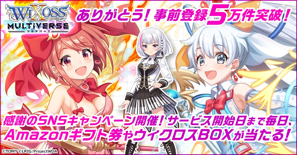 CTW株式会社は、株式会社タカラトミーより発売・展開中の大人気トレーディングカードゲーム『WIXOSS(ウィクロス)』を題材にしたG123「ウィクロスマルチバース」(以下、ウィクマル)の事前登録数が5万件を達成したことをお知らせいたします。併せて、各種SNSでキャンペーンの開催をお知らせいたします。