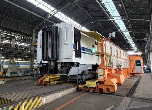 新幹線の検査を工場内で行うために新幹線を1両ずつ切り離して移動させる装置である、トラバーサによる新幹線車両の移動を見学いただきます。