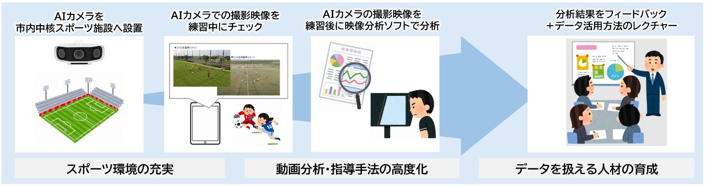 これは熊谷市のスマートシティの取組みの一環として、デジタル技術を活用した「スポーツDX」を通じた地域スポーツの振興による地域活性化について調査検討することを目的とし、熊谷市スポーツ・文化村「くまぴあ」(熊谷市原島315番地)の人工芝グラウンドにAIカメラを整備し、地域スポーツの映像化及び映像分析ソフトによる映像分析を行い、この評価・課題の検討などを行うものです。