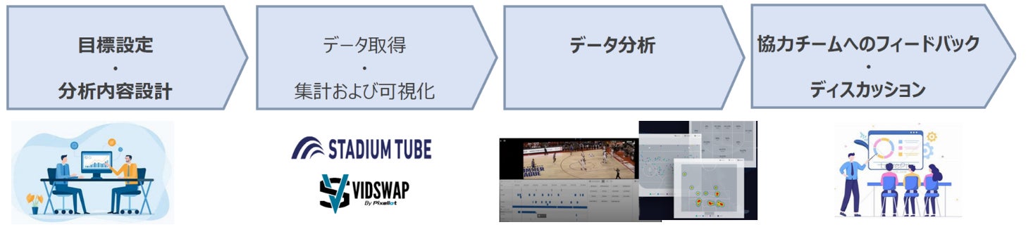 ④撮影した映像と映像分析ソフト「VIDSWAP※2」を使用し、個人及びチームのパフォーマンスや戦術データを分析し、その結果を地域スポーツ団体の監督、指導者、選手にフィードバック