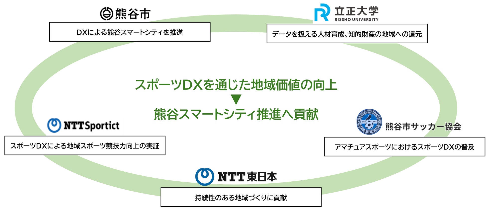 埼玉県熊谷市(市長:小林 哲也、以下「熊谷市」)と立正大学 データサイエンス学部(学部長:北村 行伸)、熊谷市サッカー協会(会長:黒澤 三千夫)、東日本電信電話株式会社 埼玉支店(支店長:市川 泰吾、以下「NTT東日本」)、株式会社NTTSportict(代表取締役社長:中村 正敏、以下「NTTSportict」)は、2025年1月17日(金)に「産学官連携による映像分析を用いた地域スポーツ活性化に関する共同研究協定書」を締結しました。