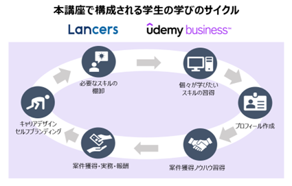 学生自身が希望するスキルを、ベネッセが国内で展開をするオンライン学習サービス「Udemy Business(ユーデミー・ビジネス)」で習得します。学生たちは、習得したスキルをもとに、フリーランスマッチングプラットフォーム「ランサーズ」で企業からの依頼を獲得し、報酬を得るまでの流れを体験します。また、ランサーズとベネッセから講師を派遣し、全4回に渡って、キャリアデザイン、セルフブランディング、スキル学習、仕事の仕方や獲得方法などについてアドバイスを行います。その中で、学生は学ぶ先に、仕事を通して自らのスキルのレベルを知り、次のレベルに到達するために必要な学びに歩みを進めることができます。