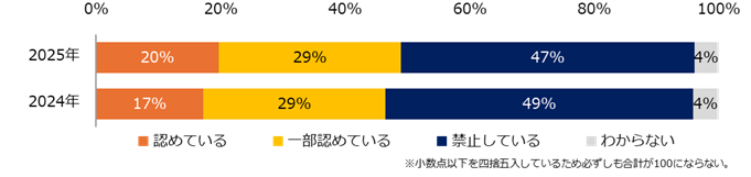 「現在、社員の副業・兼業を認めていますか?」と伺うと、約半数の49%が「認めている」(認めている:20%、一部認めている:29%)と回答。2024年に実施した同調査(※)より、3ポイント上昇しました。