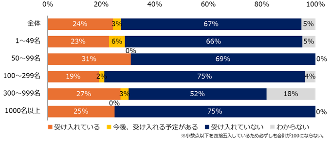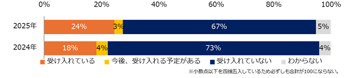 24%が副業・兼業で働く人を受け入れていると回答。前年より6ポイント上昇。受け入れている理由は「人手不足解消」「専門人材の獲得」。